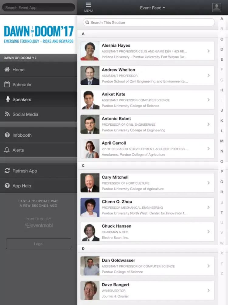 Dawn or Doom '17 is a free public conference at Purdue University designed to prompt open-minded and thoughtful consideration of the potential risks and rewards posed by the emerging technologies, while also considering how we might make sure the outcome is more beneficial than detrimental. Since it began in 2014, Dawn or Doom has annually brought together experts on relevant topics to interact with more than 5,000 attendees. Speakers include stars from Purdue’s large constellation of researchers focused on innovations that will transform lives and leading national authorities. The 2017 conference, set for Sept. 26 and 27, will highlight aspects of designing the world we live in, including: