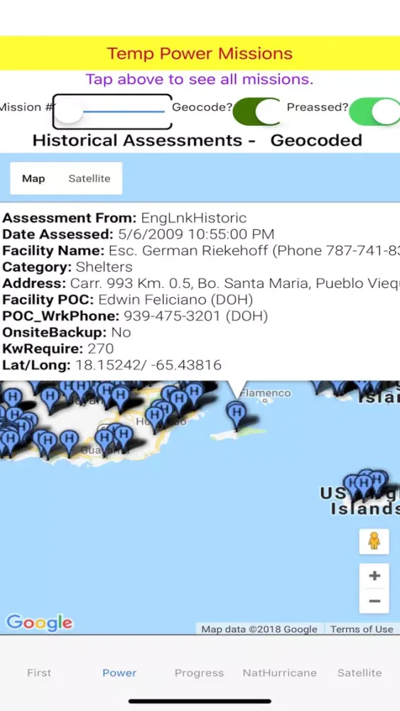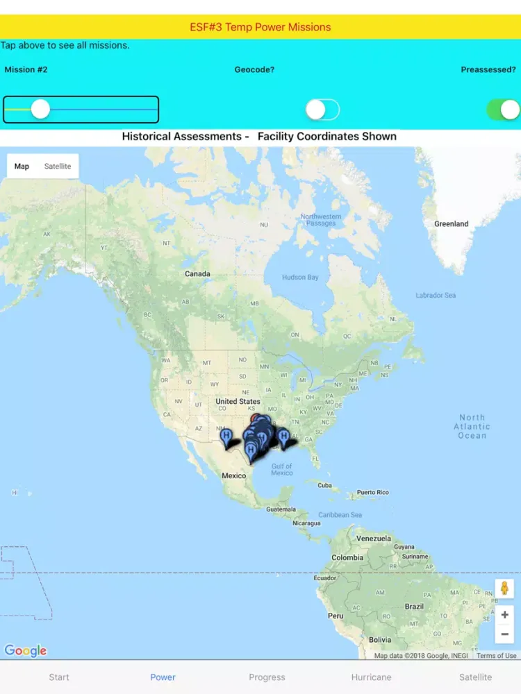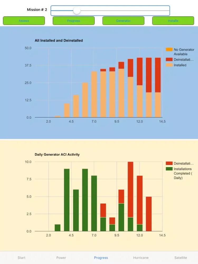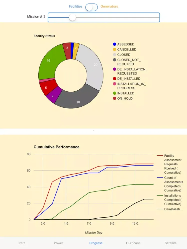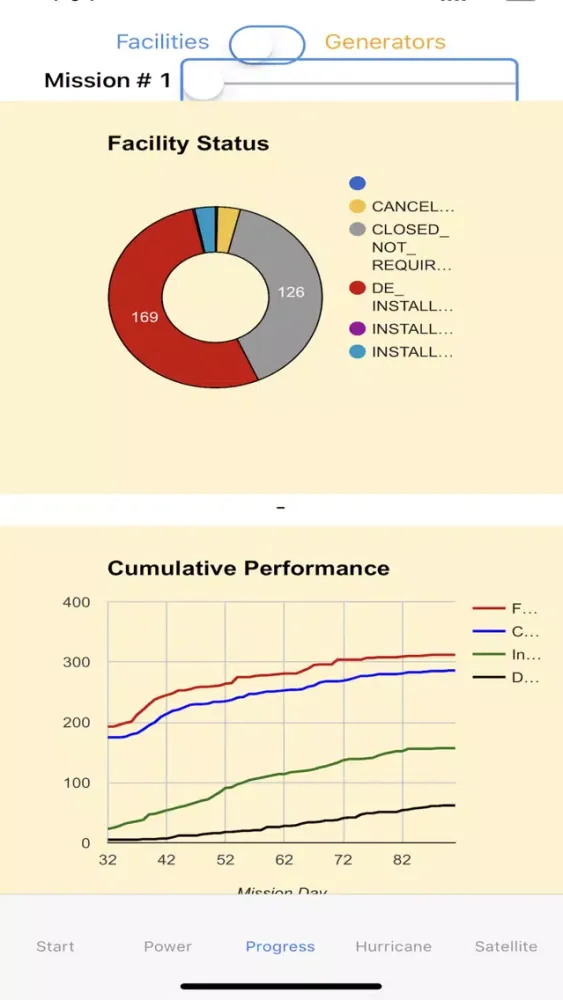 Registered users can track temporary power mission progress for taskings, assessments, installations and deinstallations of generator status using both maps and charts. Typically, the data is several hours old during most missions. Comments and suggestions are solicited. Emergency Responders should request a free registration code (new with this version) by tapping the "Request Code" button on the Start Screen.