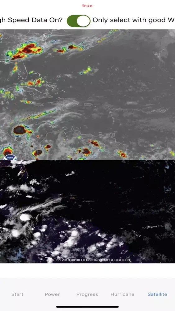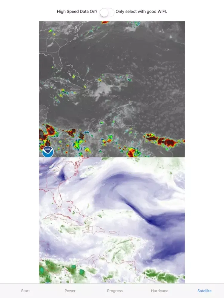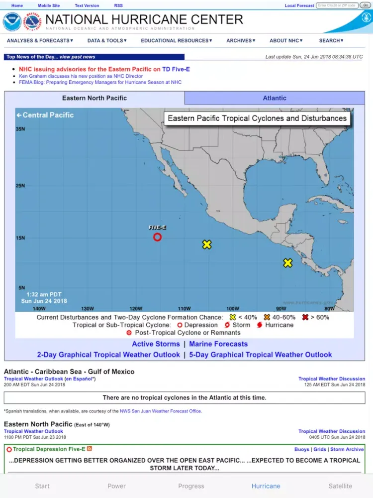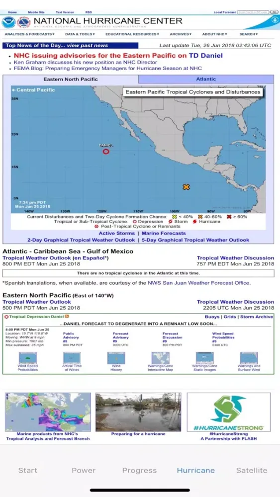 App contains links to National Hurricane Center, GOES and Joint Typhoon Warning Center websites and displays current information.