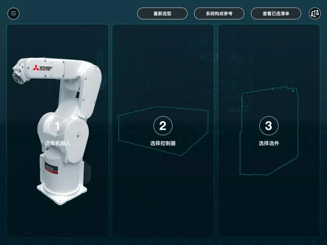 -用户可在『选型中心』模块中选择机器人和控制器,并且选择特定型号机器人或控制器对应的配件,还可以查看系统的构成。