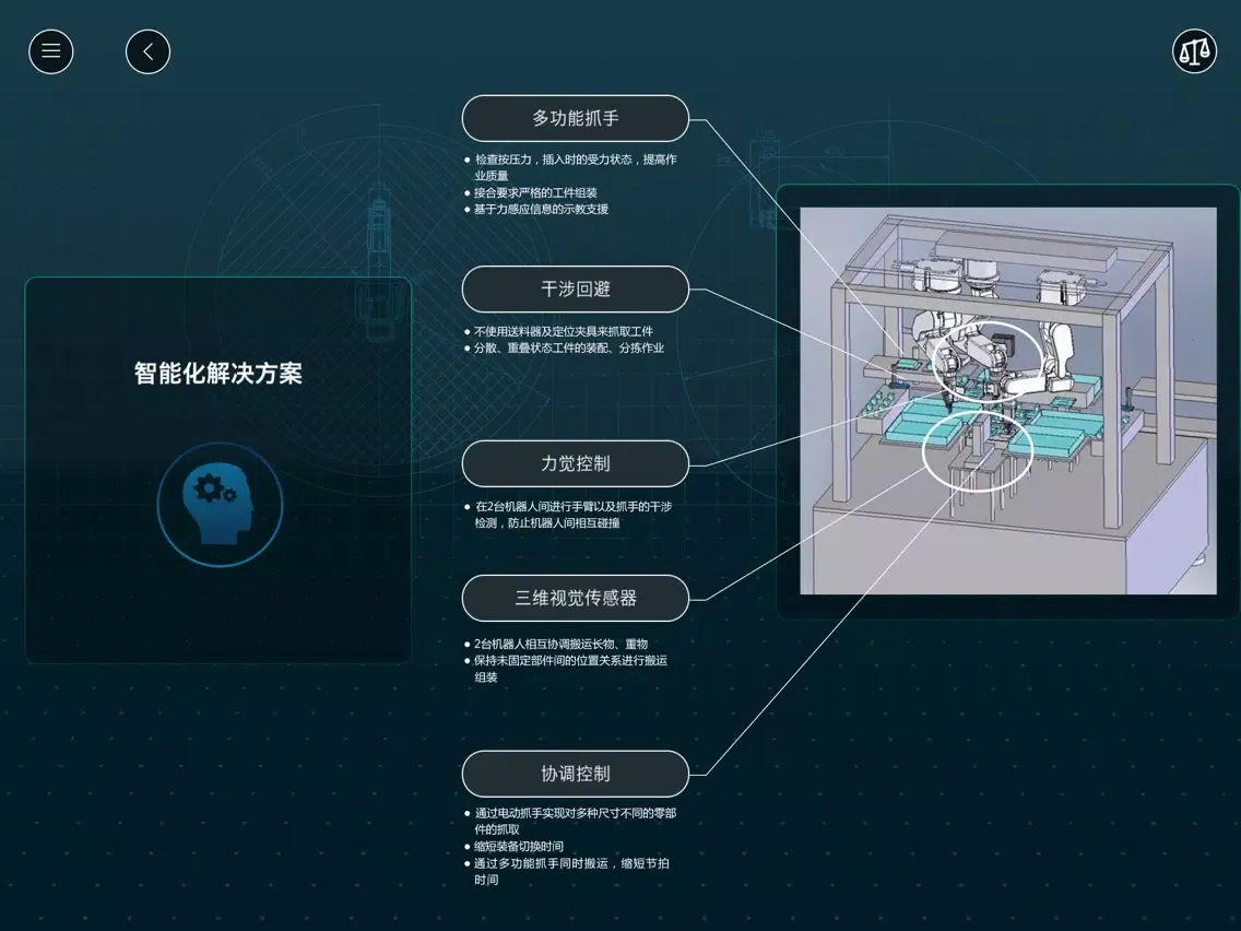 -在『产品中心』里,用户可以通过手指滑动控制机器人的360°旋转及机械手臂运动,全方位展示产品特点。