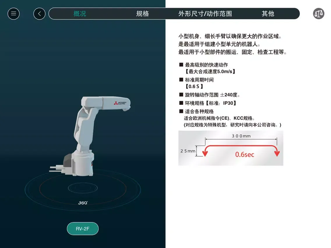 三菱工业机器人eBook包含了动感而详细的产品展示、灵活的型号筛选、方便的功能查询以及机器人力矩计算等功能。为使用者全方位了解三菱RV-F系列机器人提供了全新体验。