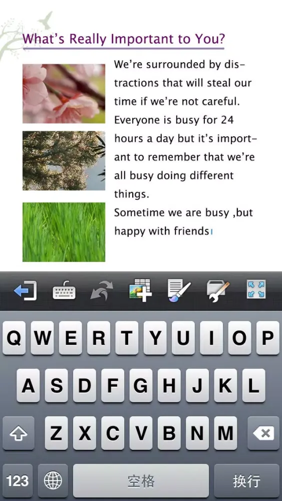 • Rich-text formatting: Bold, italic, underline, highlight, subscript/superscript, alignment, line and paragraph spacing, first-line indent, type size, page breaks, pre-defined styles, text and paper color, etc.