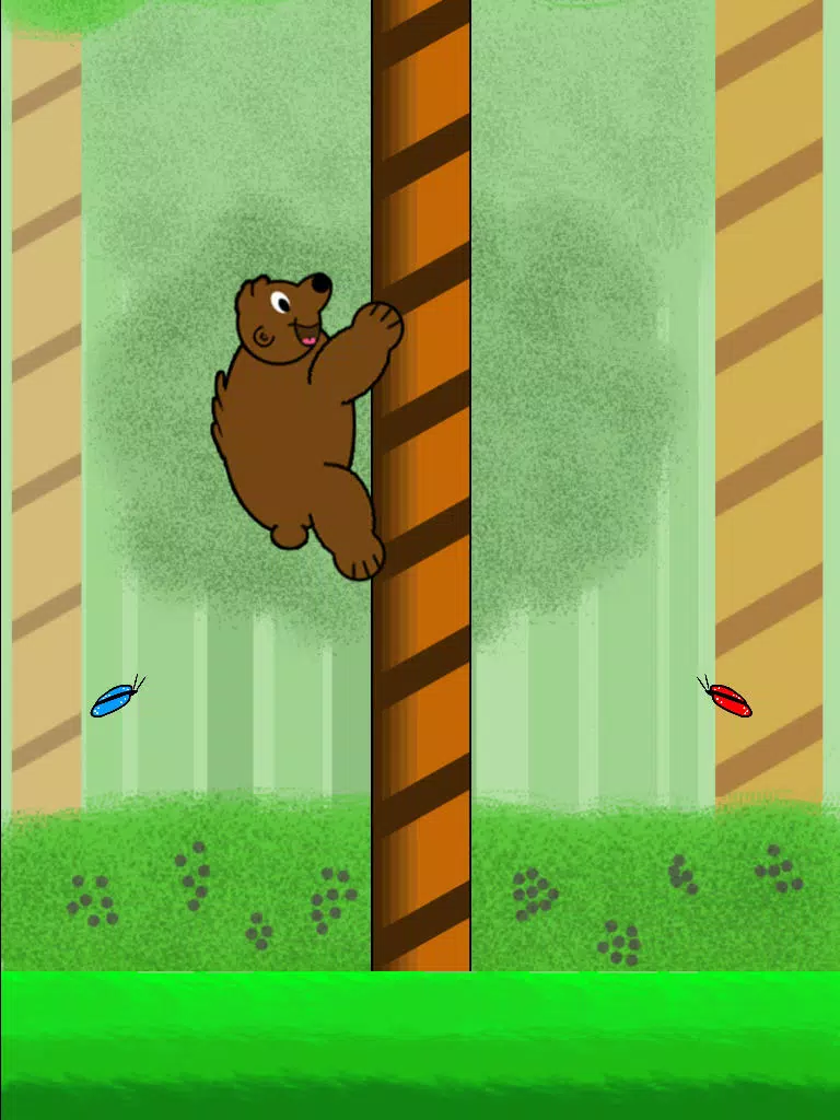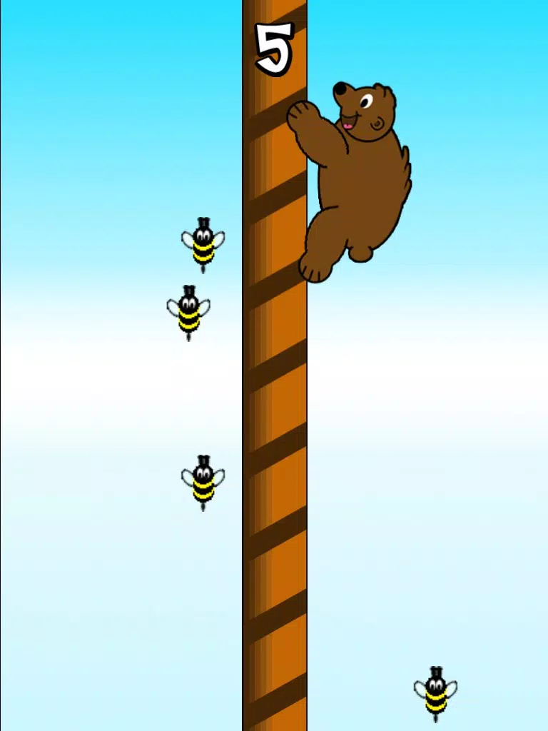 Get ready for the ultimate battle: Bear vs. Honeybee! Join Barry the fuzzy Bear in the bee-utiful forest! He wants to get the honey in the beehive found at the top of the swirl tree because he is sick of constantly eating peanut butter and jelly, but he can't do it alone! The buzzing bees don't want to give up their honey! Dodge, get competitive, and react fast as you zigzag your way up the tree to get the nest of honey in this fun, compulsive game developed by Jon and Jordan Ferris!