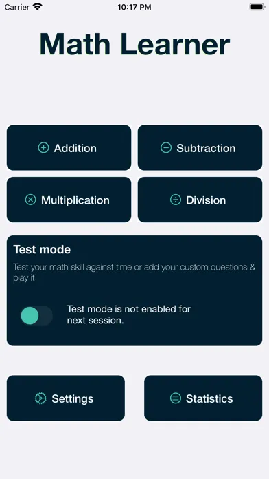Math learner app also offers user to change test mode timing from settings page of the app.Learn basic mathematics and see how you are doing as math leaner app show user statistics, per individual math operator in average seconds taken by user to solve question in both app modes.