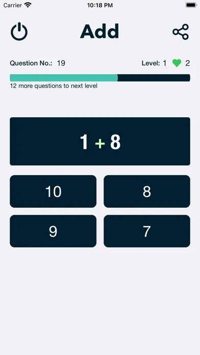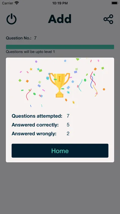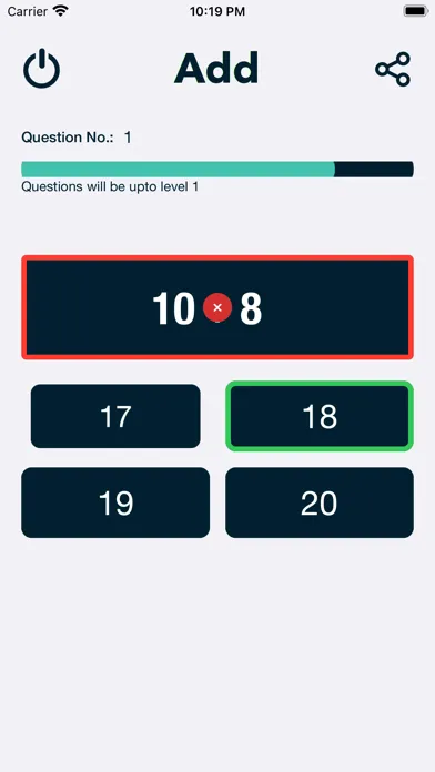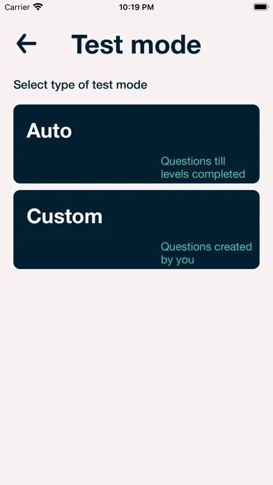 Test Mode:- Two type of tests1) Auto :- In this test mode of math learner app , user has a specific time period to answer the question. If user fails to answer question specified time interval, app will change or move to next question. During test mode user will get questions as per the levels completed during learning mode and difficulty level set in settings page of the app.