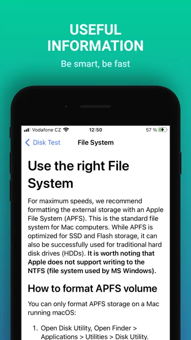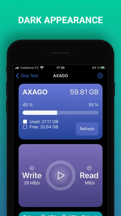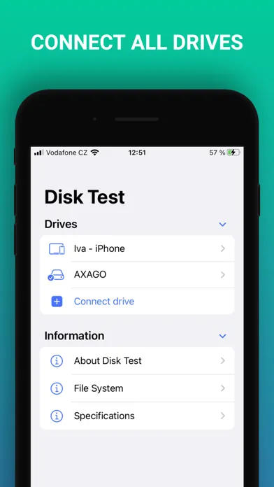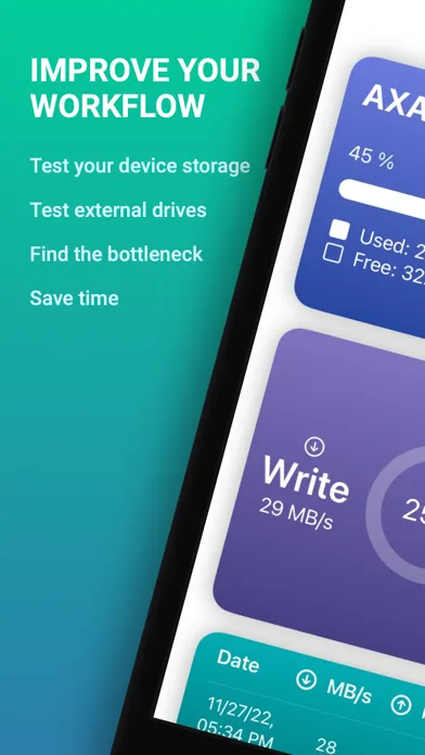 With Disk Test, you can easily test your device's storage speed and also measure how fast your device will work with all types of external storage such as external drives, USB Flash Drives, memory cards, etc. This clever assistant will help you to effectively detect weak points in your workflow.