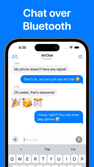 AirChat connects you to people nearby and allows you to send and receive chat messages over WiFi or Bluetooth. Perfect for situations when you have no internet connection, like on a plane or when travelling abroad. Messages are sent directly to each device, so your privacy is guaranteed.