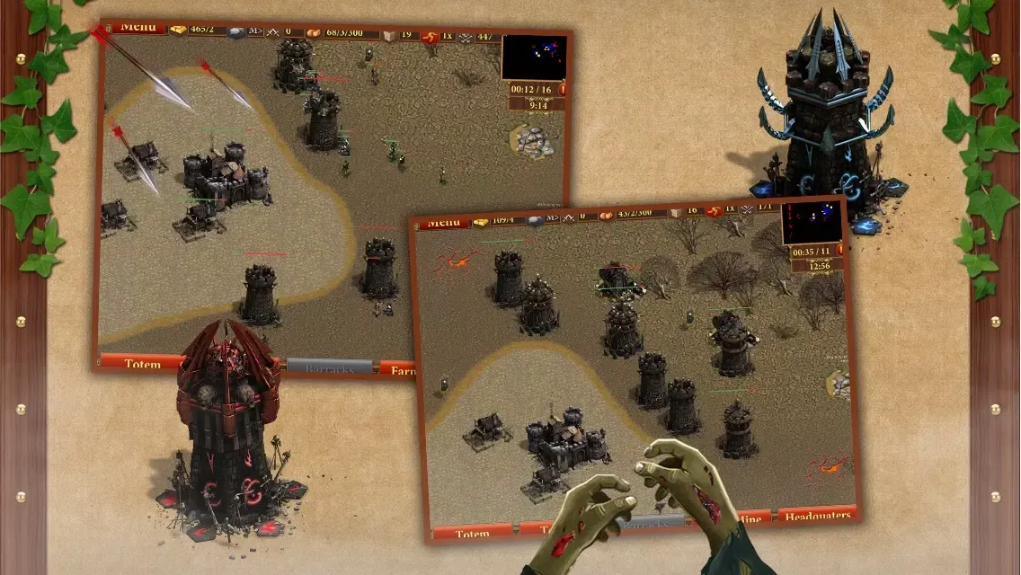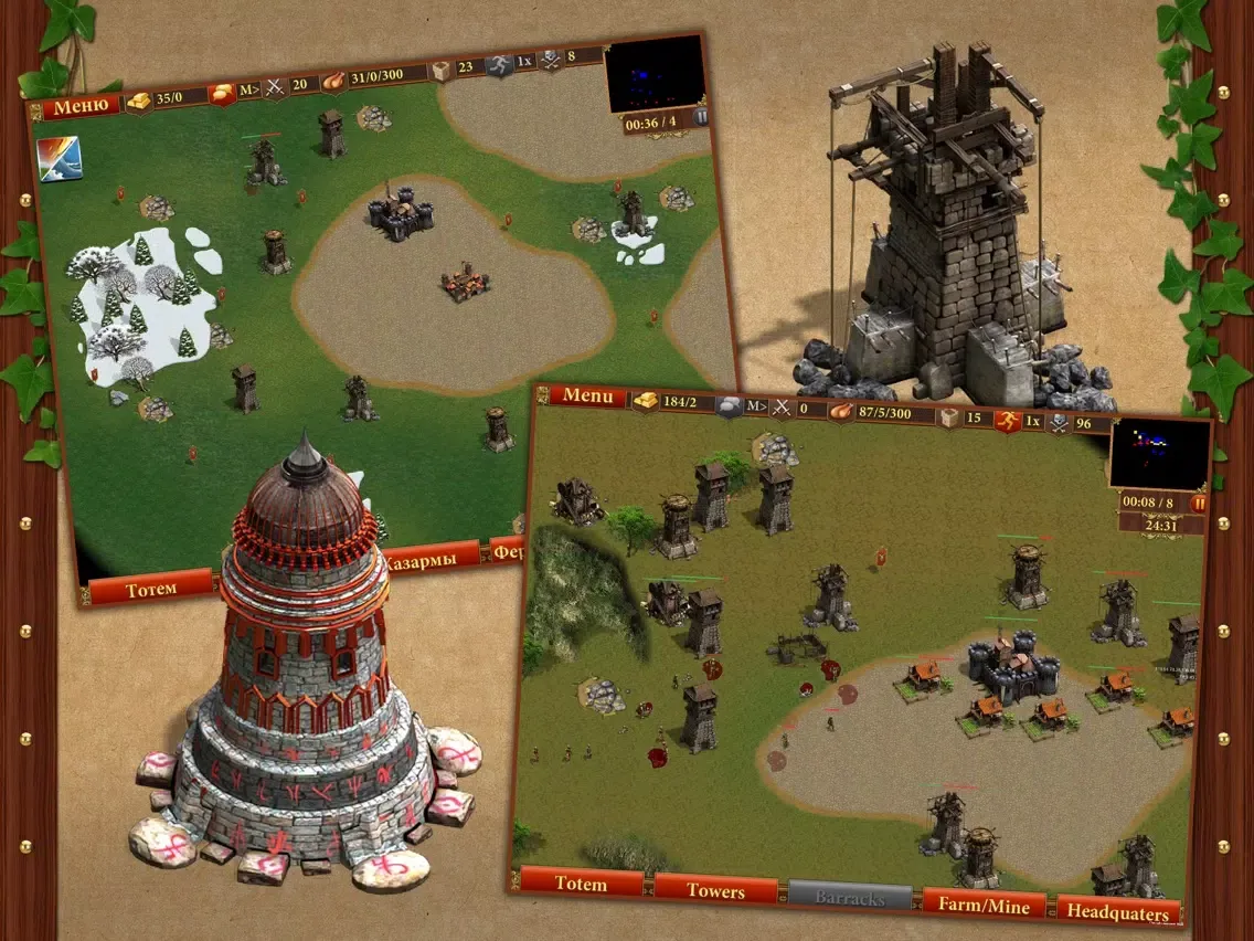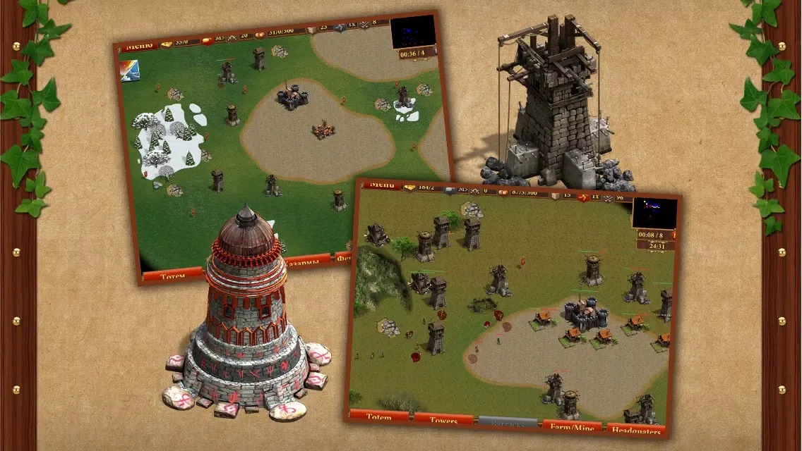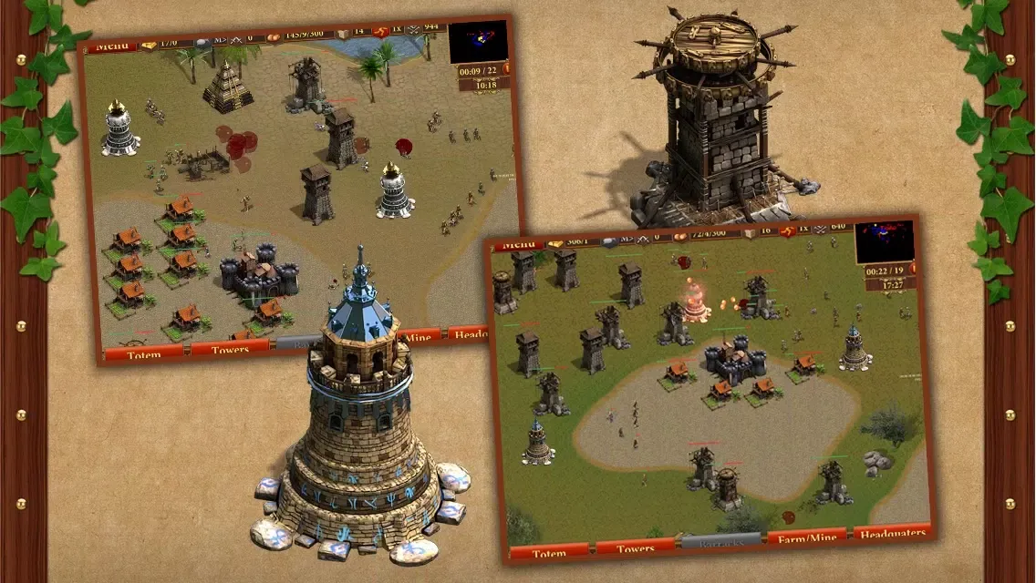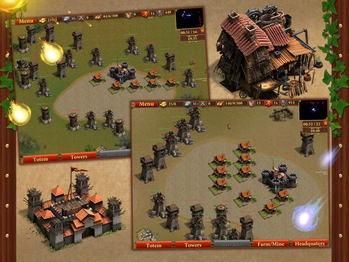 After learning the basics from the tutorial, you get to choose your game mode: “survival” or “find and defense”. It will then fall unto you to defend your people against raging hordes of enemies: to accomplish such a feat, you will need to build from various building types: totems, towers, barracks, farms/mines and headquarters. Upgrading your structures is vital, as only then will you be able to unleash their full potential and destroy those cowardly and dishonorable enemies.