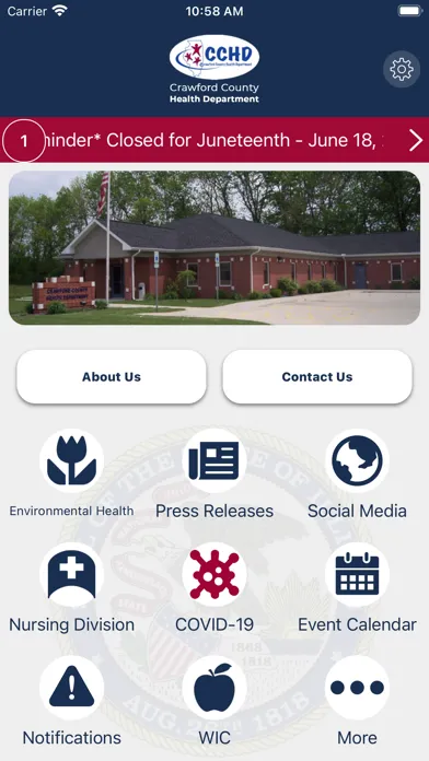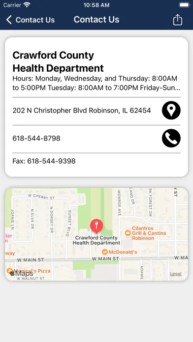 The Crawford County Health Department, IL mobile application is an interactive app developed to help improve communication with area residents. The CCHD App allows residents to access important alerts, health services, WIC info, view resource maps, as well as providing the community with the latest public health news and information.