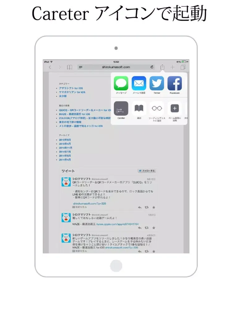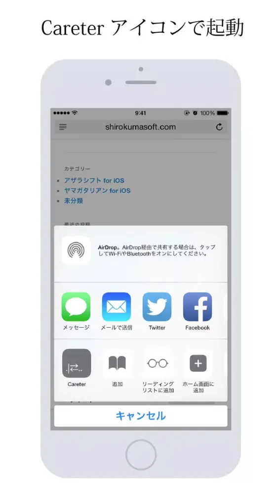 Safari起動->下部中央のボタン->その他->Careter スイッチON->Careter アイコン選択