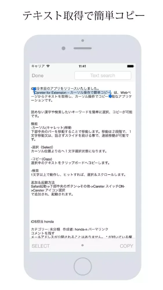 「Careter for Extension - カーソル操作で簡単コピー」は、Webページからテキストを取得し、カーソル操作でコピー可能なアプリケーションです。