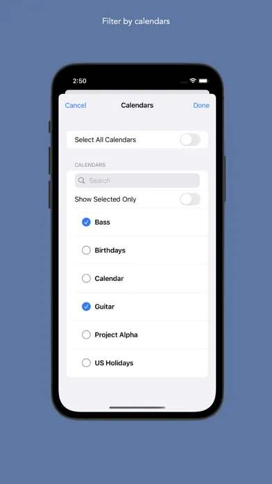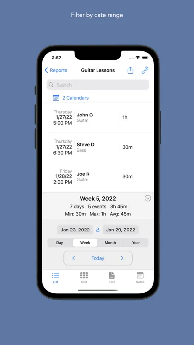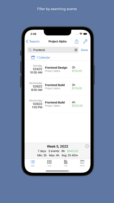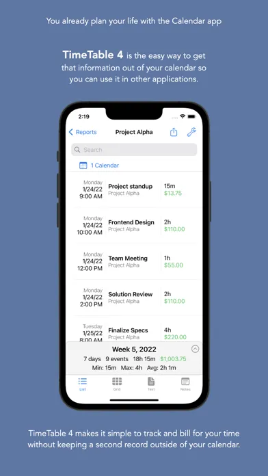 TimeTable makes it simple to track and bill for your time without keeping a second record outside of your calendars. You can find trends in your calendars by searching the details of your events and viewing the average, maximum and minimum times you have spent.