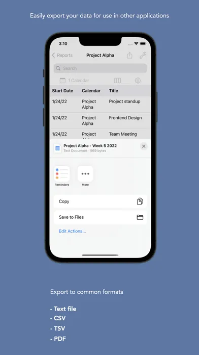 TimeTable can export this data to email, text or comma separated values to use the results in other tools like email, invoicing, time tracking or spreadsheet applications.
