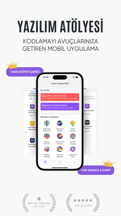 "Yazılım Atölyesi Akademi"ye hoş geldiniz! Bu mobil uygulama, kodlama bilgisine kolayca ulaşmanızı sağlar ve sizi programlamanın büyülü dünyasında dönüştürücü bir yolculuğa çıkarır. Türkiye'nin en başarılı mobil kodlama öğrenme uygulaması olarak, Apple'ın Günün Uygulaması ödülüne layık görüldük ve bu alanda en çok indirilen ve en yüksek puanlı uygulama olmayı başardık.