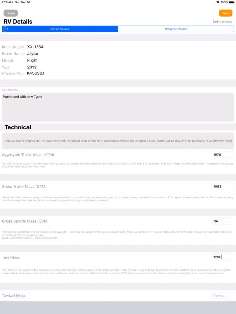 This feature allows you to store there weights of your RV both the plated weights that are listed on your RV's Compliance Plate, as well as the Weights that you have recorded via a Weighbridge.