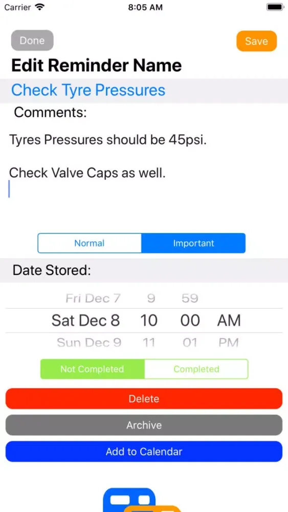 You can enter your own information and comments, or select from the suggestion list built in to the app. You can enter comments as well as a Reminder date and time so your Apple device with send you a notification.
