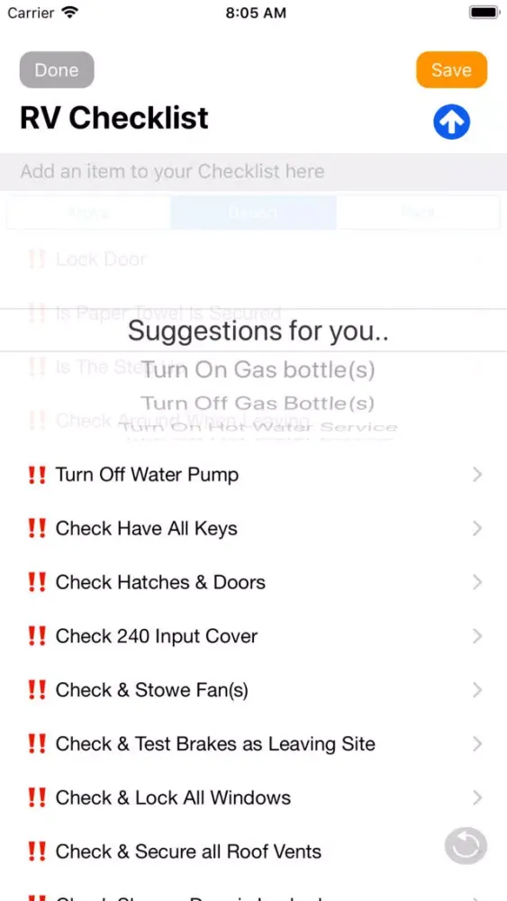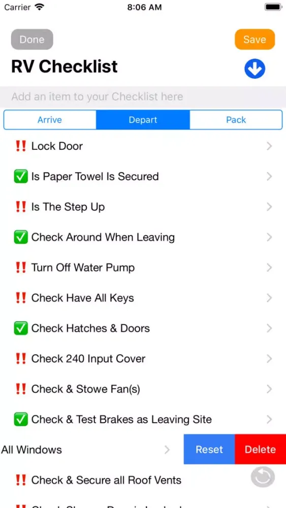 RV Reminder will allow your to build your list for Depart or Arrive.