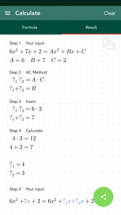 For factoring quadratics this app uses the AC method. For this, only three variables must be entered. The solution is shown step by step. All calculations are stored in the history. The final solution can be shared.