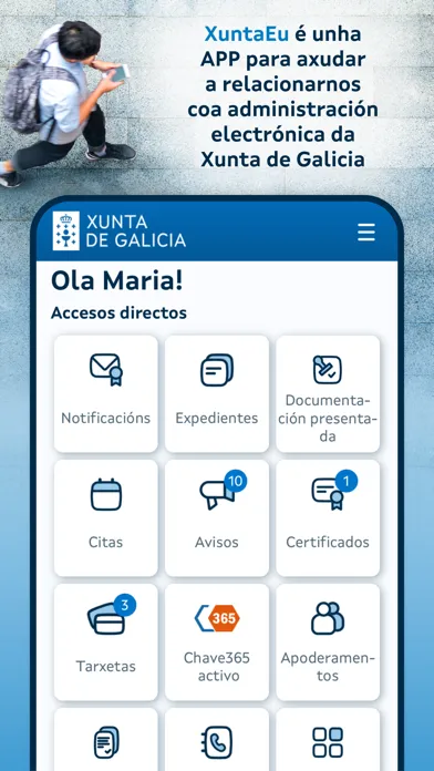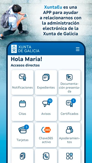 Permite recibir avisos personalizados, xestionar usuario de Chave365 (cambiar clave de acceso, renovar, modificar teléfono móbil ou darse de baixa) ou consultar expedientes e presentacións igual que na sede electrónica. Tamén permite consultar citas coa Administración, a verificación de documentos electrónicos firmados, e a consulta e modificación dos datos de contacto, dirección etc. da Carpeta Cidadá. XuntaEu ademáis permite a consulta de apoderamentos recibidos e outorgados, aceptar ou rexeitar notificacións do Sistema de Notificacións de Galicia (notifica.gal), así como consultar tarxetas e certificados persoais como poden ser: