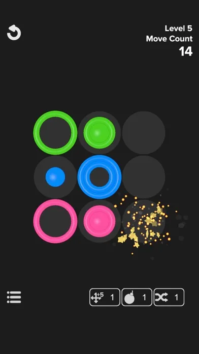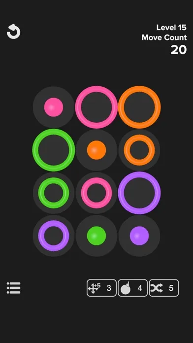 Simply swipe to move rings on the board. Arrange them to fit one within the other. Stack three rings of the same color. Match them all and clear the board. Watch your move count.