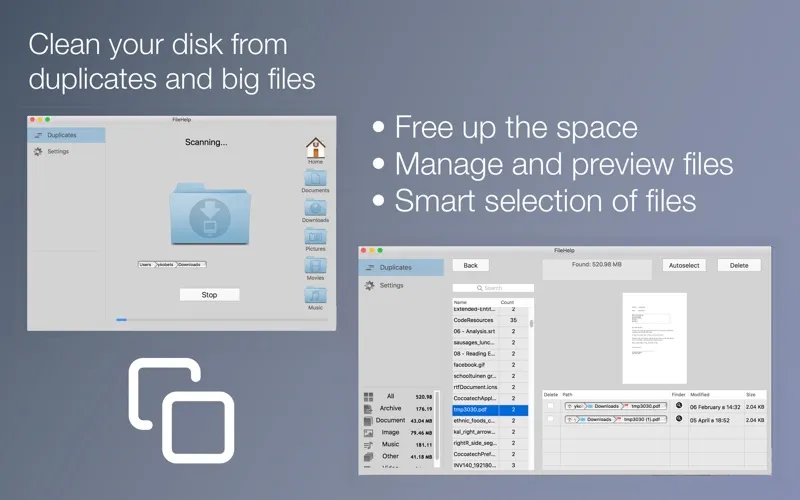 Free the disk space! The application will find all duplicates and large files and remove it.