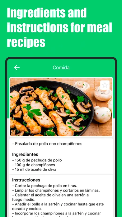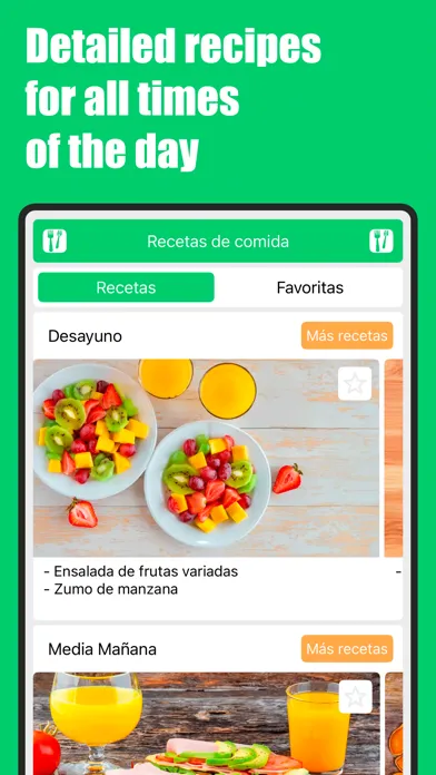 - Meal recipes: Enjoy a wide variety of recipes, organized by breakfast, mid-morning snacks, lunch, afternoon snacks, and dinner.