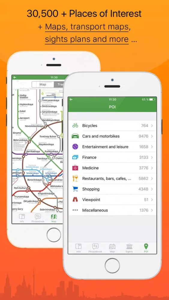 • Points of interest: shopping places, entertainment and recreation, cafes / restaurants, banks and ATMs, pharmacies, toilets, police, viewpoints and more on the offline map of Moscow.