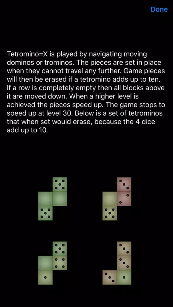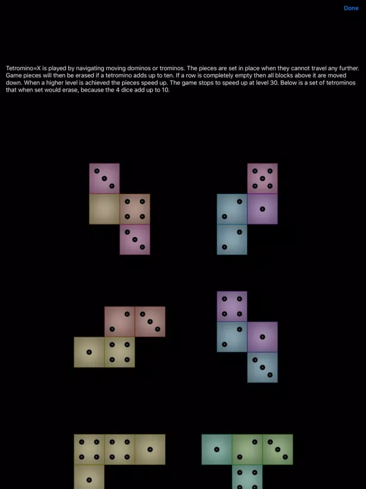 Tetromino=X is a puzzle game consisting of game pieces that build up on the game board. The pieces are numbered and colored, and consist of a group of two (domino) or a group of three (tromino) dice together. As game pieces are added to the board, groups of four adjacent pieces that add up to 10 are erased from the board. If an entire row is empty the pieces above it are moved down. To get further in the game you will have to place and count fast, because the pieces begin to speed up until level 30! If you are up for a challenge, try this fast-paced puzzle game.