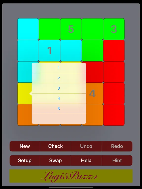 Logi-5 Puzzle is a variation of Sudoku game. A 5x5 grid of squares is divided into 5 irregular (or pentomino) regions, each with 5 squares of the same color. The objective is to fill the grid so that each row, each column, and each region contains all of the 5 digits from 1 to 5. In other words, each digit should appear exactly once in each row, each column, and each region.