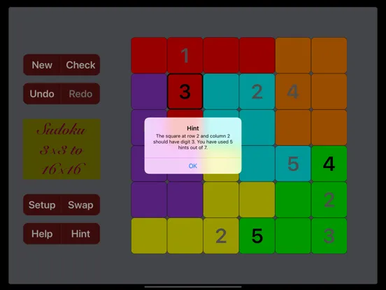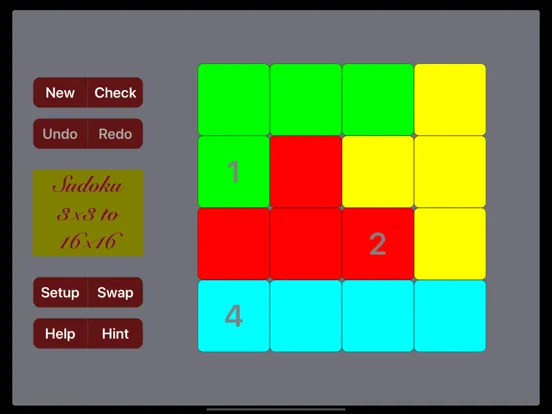 Tap the "New" button to start a new puzzle. Tap the "Check" button to check the correctness of the result. Tap the "Undo" button to reverse the previous actions. Tap "Redo" button to restore those actions reversed by "Undo". Tap "Setup" button to configure various settings. Tap "Swap" button to play two games simultaneously and switch between them. Two games have independent setups to choose different sizes. Tap "Help" button to get instructions. Tap "Hint" button to get a hint, if you have used "Setup" button to allow a hint.