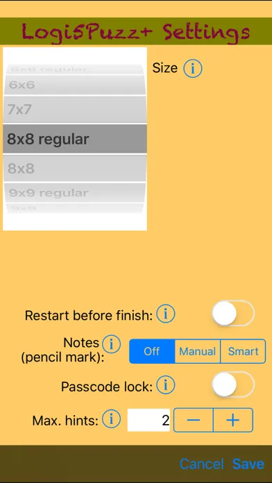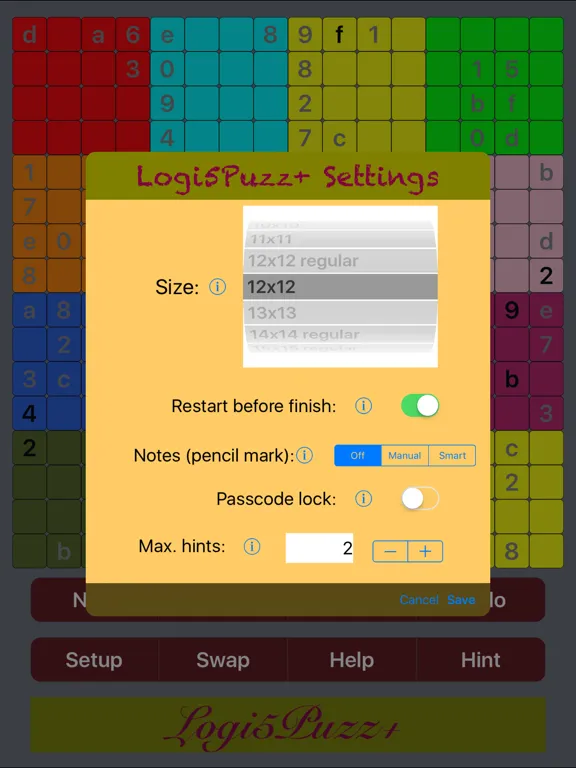 The app can be configured to provide optional hints. A passcode can be set to lock the options on the maximum number of hints allowed, or whether restarting the game before finish is permitted. For example, a parent can lock the options with a passcode to ensure that a child honestly finishes a puzzle without any hint or restarting.
