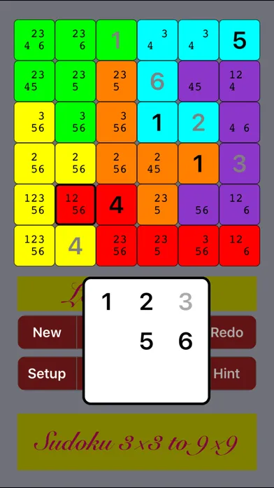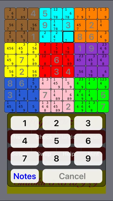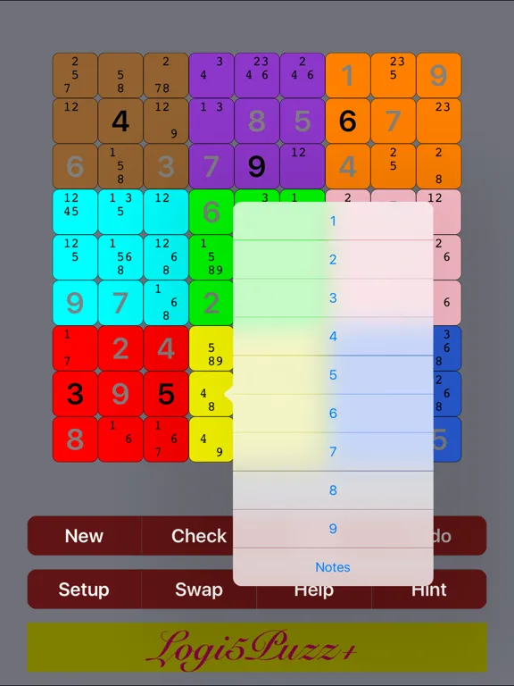 Tap a square and a list of digits plus a blank button will pop up for the player to choose a number to fill into that square. Select the blank button to clear the existing number in the square. When notes (pencil mark) are enabled by "Setup", tiny notation digits inside each empty square are entered automatically (with smart option) or edited manually by selecting the notes button.