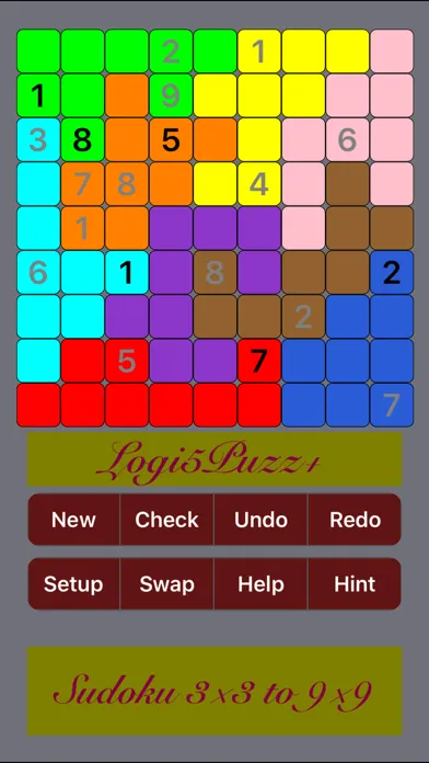 Logi5Puzz+ extends the grid sizes from 3x3 to 16x16, with or without regular option. A 9x9 regular choice with 3x3 square block for each region is the same as the common Sudoku game. A 4x4 regular grid has 2x2 square block for each region, a 6x6 regular grid has 2x3 rectangle block for each region, a 16x16 grid has 4x4 square block for each region, and so on. The shape of each region is random for irregular grids (or jigsaw sudoku) of all sizes.