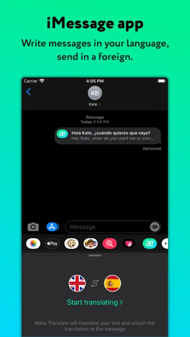 - iMessage App. Write messages in your language, Mate will translate them on the fly and send in the recipient's language. Or vice versa.