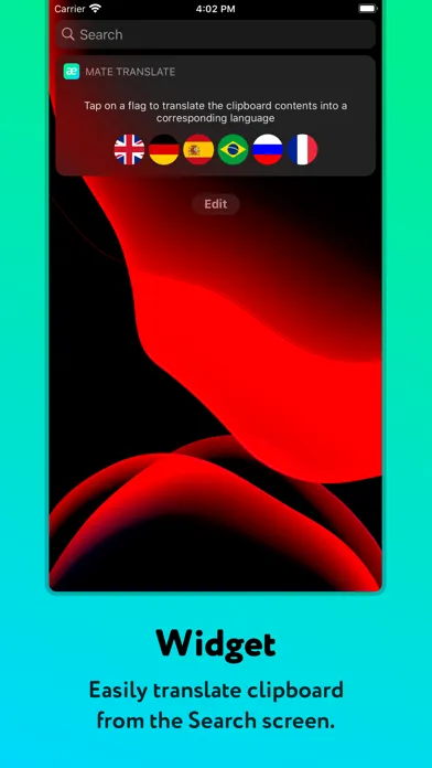 - Widget. Translate clipboard contents by long-pressing Mate's icon on home screen or from the Search screen.