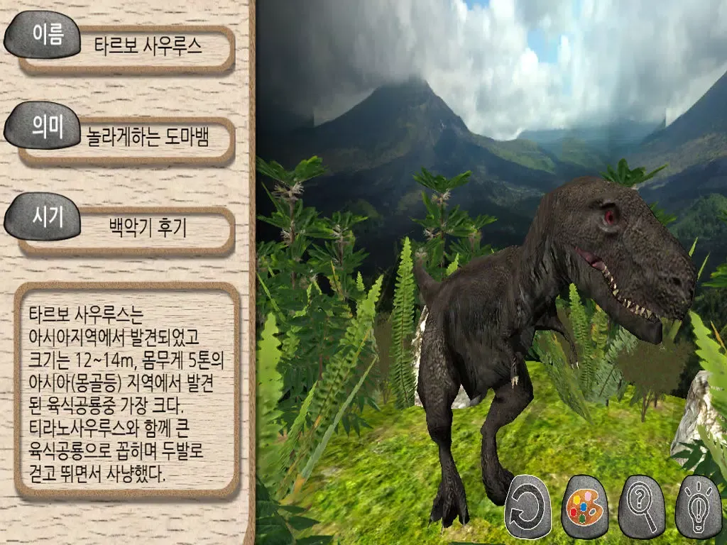 - 3D 가상체험과 함께 반복적인 학습효과를 위하여 공룡이름, 공룡 별명, 공룡이 살았던 시기등을 반복하여 볼 수 있으며, 현미경 버튼을 누르시면 공룡들의 주요 특징등 각 공룡들의 자세한 정보가 설명되어 있습니다.
