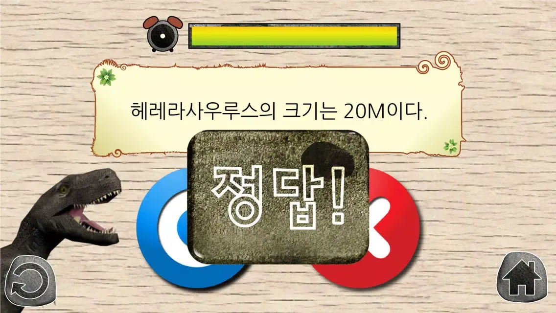 - OX 스피드 퀴즈 : 앱(App)에서 체험한 정보들을 활용해 각 공룡들의 OX 스피드 퀴즈를 풀 수 있으며 자연스럽게 학습을 유도합니다. 60초에 몇개의 문제를 맞출 수 있는지 확인해 보세요.