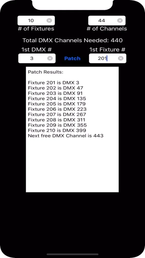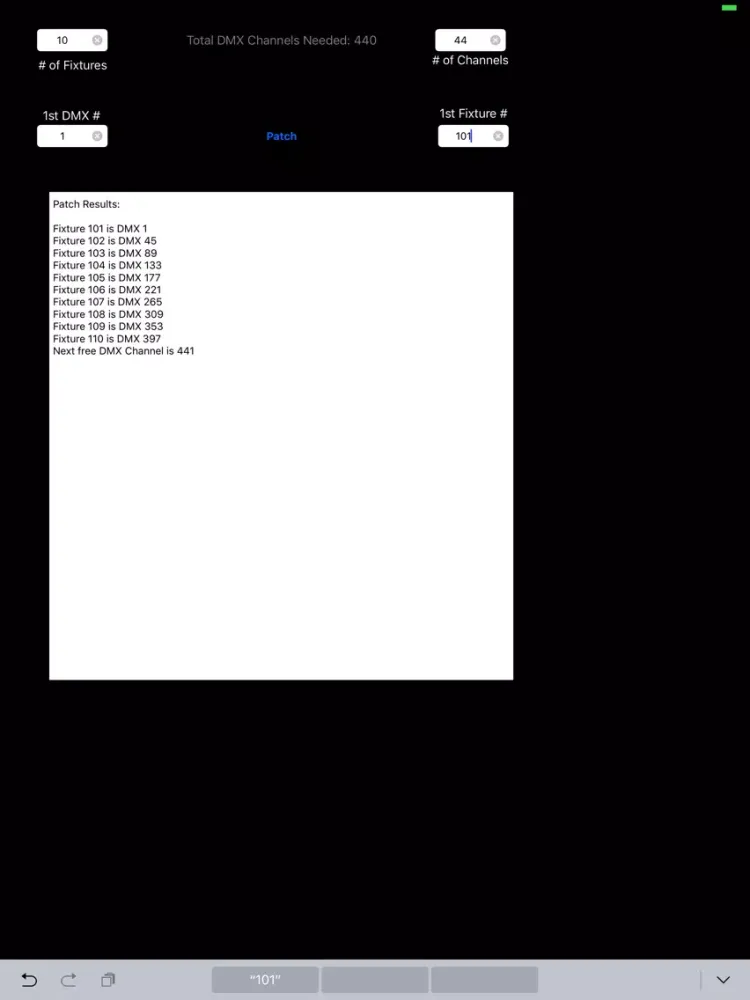 Simple DMX patching program. Enter number of fixtures, number of dmx channels, first dmx channel, and board control info, and receive straight forward easy to understand results for your patch.
