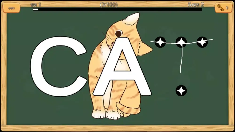 เกมเขียนคำศัพท์จากการเดารูปภาพเพื่อฝึกฝนภาษา เมื่อดูที่รูปภาพและเดาว่าเป็นคำศัพท์อะไรได้แล้วจากนั้นเขียนคำศัพท์โดยใช้จุดสีดำเป็นตัวนำ ถ้าถูกต้องก็จะปรากฏอักษรขึ้นมา เมื่อครบแล้วจะกลายเป็นคำและได้คะแนน