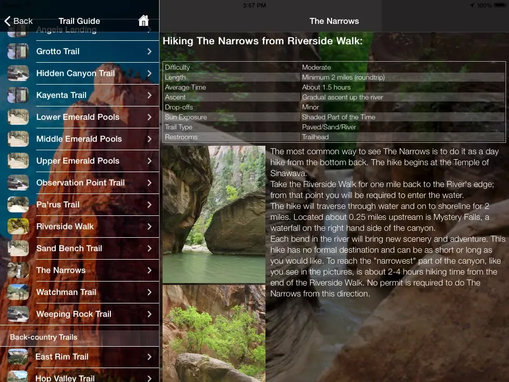Information sections help simplify planning your visit to Utah. Interactive maps, GPS functionality, detailed park information, and site identifying photos help optimize your vacation time and provide a unique keepsake from your trip.
