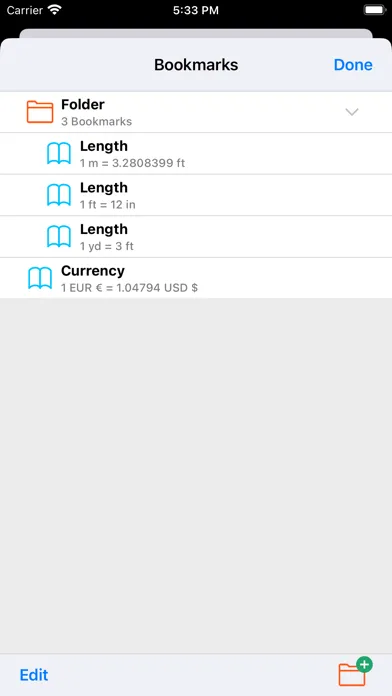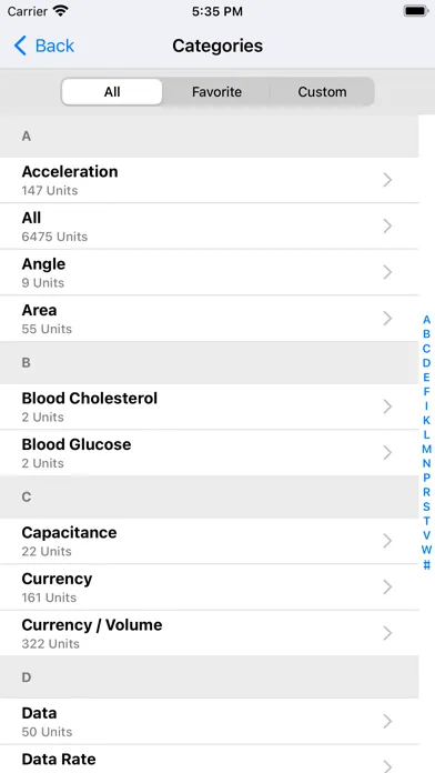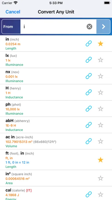 As you type, the most likely units appear. Once you have selected a unit, the other unit is automatically restricted to the category of the current unit. At any time you can browse through the complete list of units available by tapping on the buttons to the right of the input fields. Advanced features include bookmarks and an integrated calculator. With over 6,400 units, this is the only unit converter you will ever need.