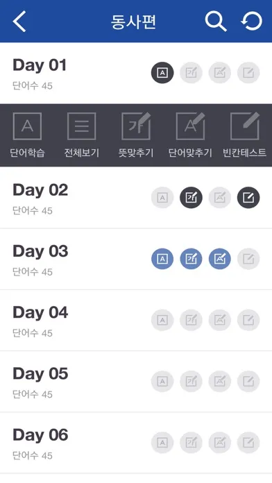학습한 단어를 다양한 테스트를 통해 복습할 수 있도록 하였습니다.