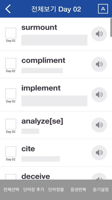 3. 전체보기 : 단어장 형식으로 구성되어 교재순·알파벳순 ·랜덤으로 학습 가능한 DAY별 단어 전체 학습 (빠른 복습을 위한 가리기 기능 추가!)
