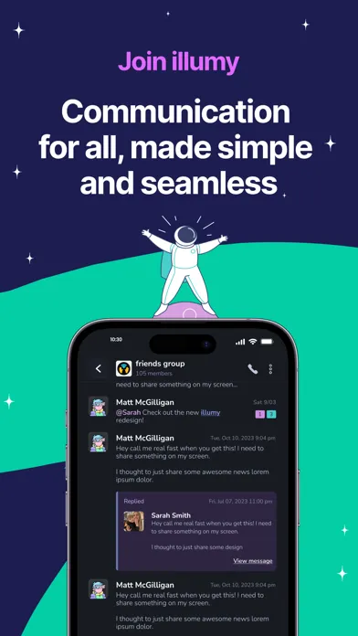 Chat with up to 100 people at once. Invite your parents, coworkers, weekend squad, sports team, club, or other group to message together and chat about anything. Save time by posting photos and sharing in one place. Coordinate with a group for your next meetup. Owners can manage their groups and easily add and remove group members using group settings. Even include people outside of illumy by using their email.