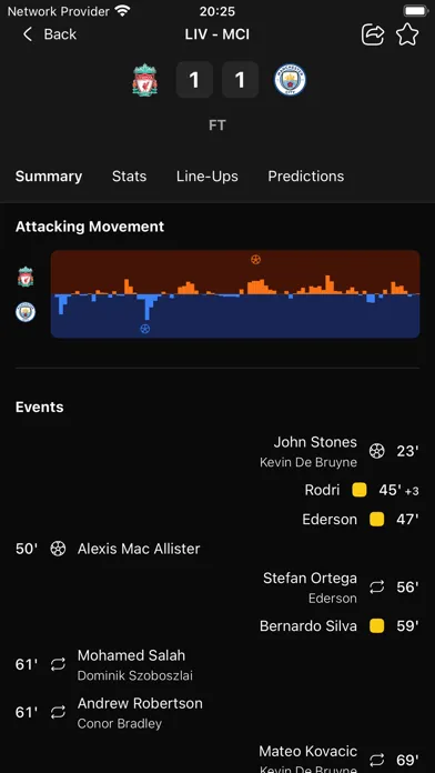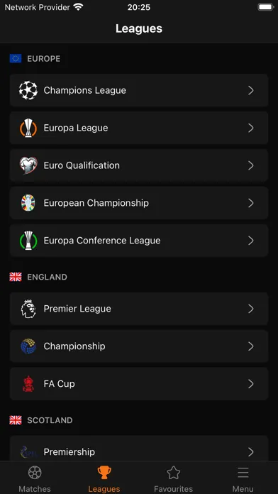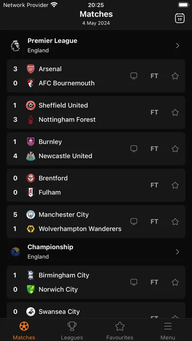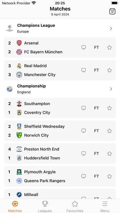Set your favorite matches as favorites and get push notifications for: final results, half-time scores, kick-off, red/yellow card alerts, and goal notifications.
