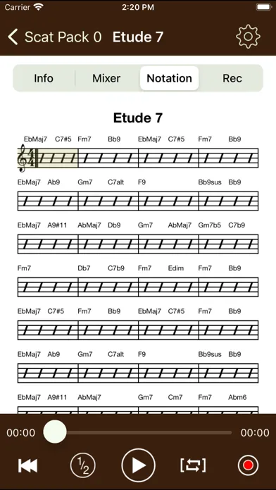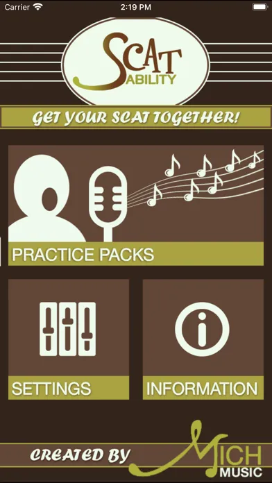 ScatAbility is a practice app for scat singing. It utilizes the simple method of listening and imitation to get you scatting quickly, and musically. The focus is on singing, not thinking, similar to the immersion process of learning a language. Knowledge of theory, jazz chord types, progressions and scales, though beneficial, are not required to use this product.