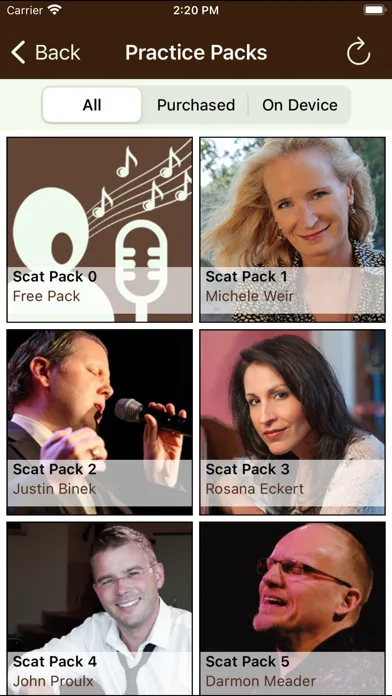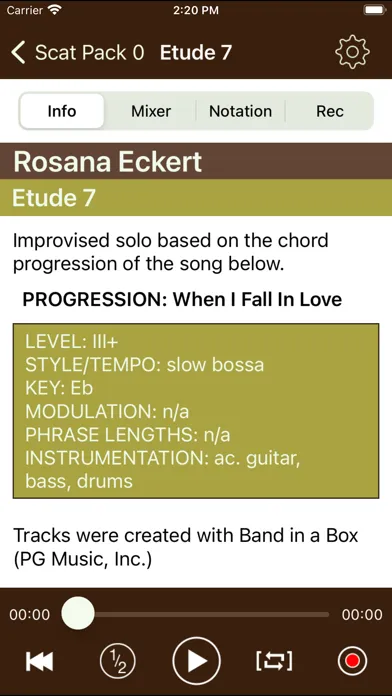 ScatAbility is easy to use: sing exercises, call & response and etudes with great jazz singers including Darmon Meader, Rosana Eckert, Greg Jasperse, Kate Reid, Justin Binek, Michele Weir, John Proulx, and more to be added soon. Mute the vocals to practice on your own with the backing tracks, and when ready, record yourself, listen back, then export for other uses!