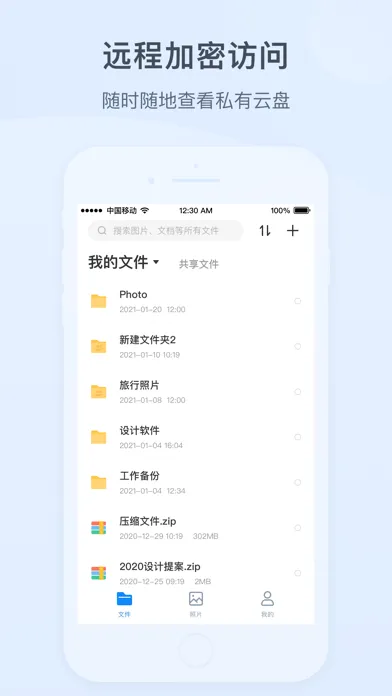 1. 安全访问:无需公网IP、端口转发、DDNS等复杂网络设置,使用P2P穿透技术,穿透模式下手机直接连接不经过云端转发;数据采用RSA加密,最大限度保护数据隐私。让你只需要拥有一部手机,就可以随时随地安心访问家里的私人云盘!