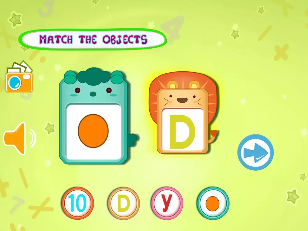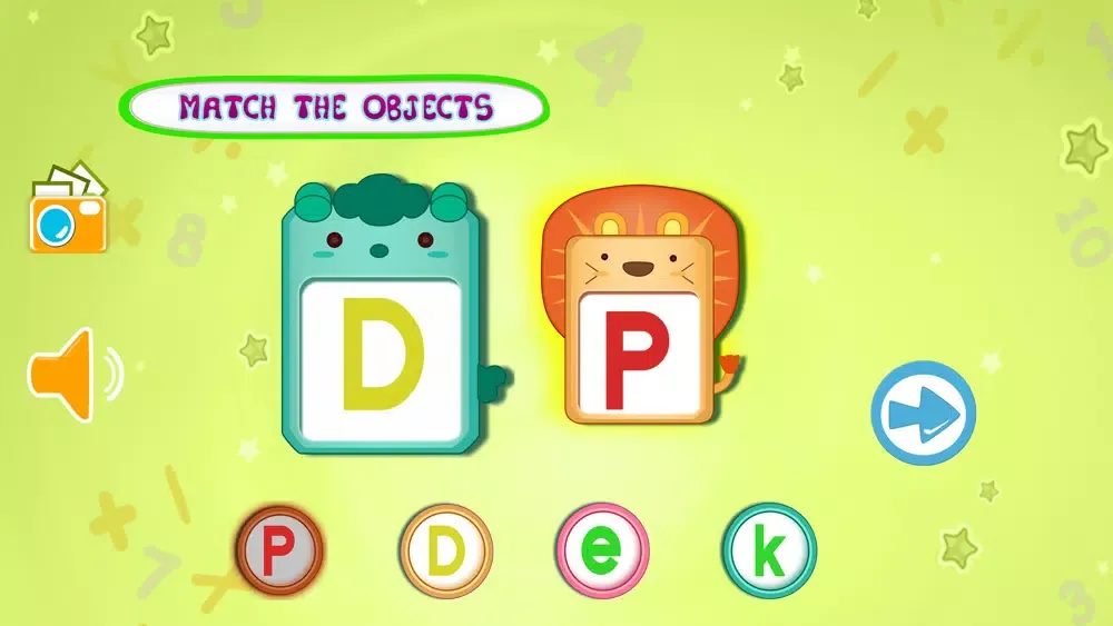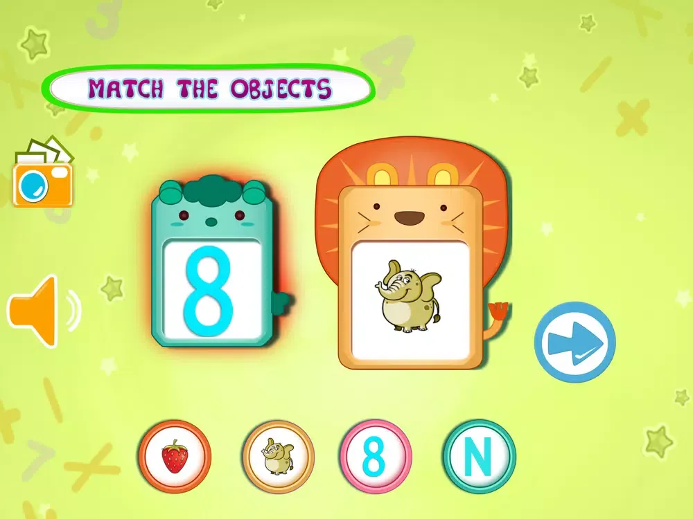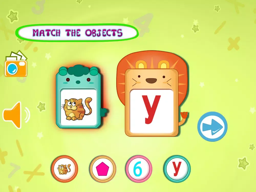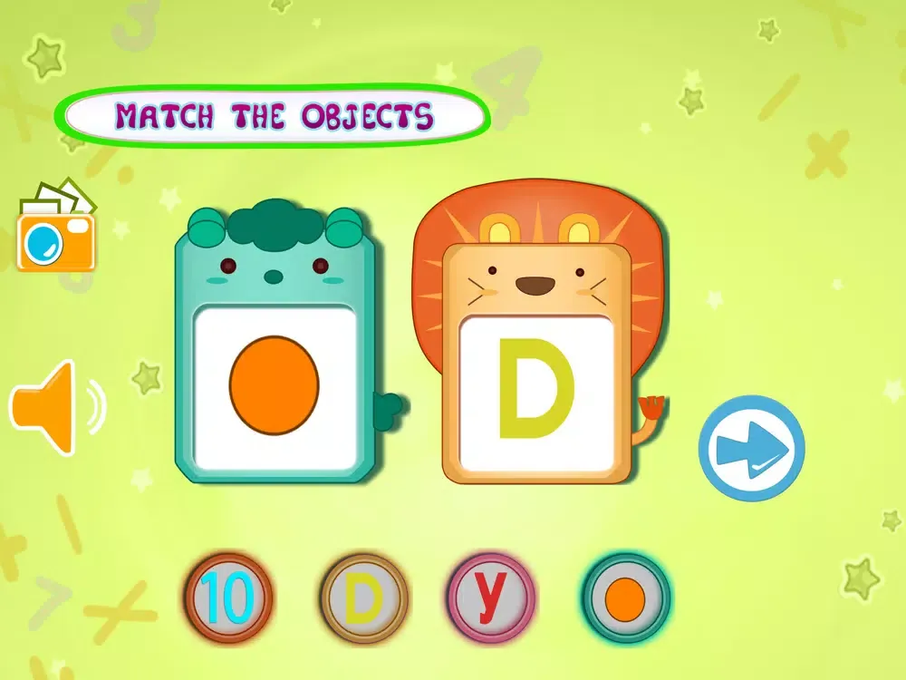 In Kids Learning- Object Matching there are two big object shown in the middle of the screen , that can be alphabet , number or an image of an object from an epic books and 6 round circle contains 6 different object .